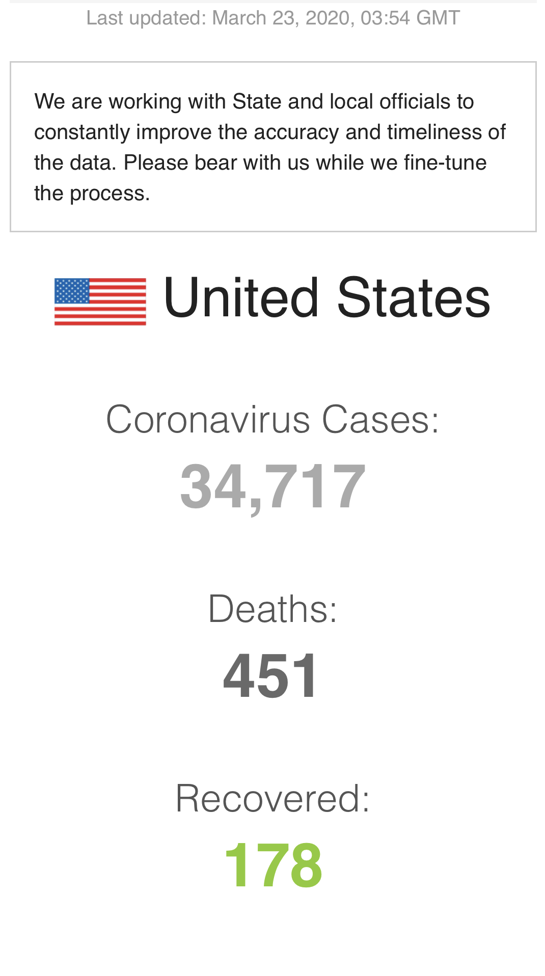 The count on March 23, 2020. I check the Worldometer daily.